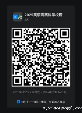 第一步:扫描下面的二维码加入钉钉群或联系武雁飞老师,群名“2025英语竞赛东风校区”或“2025英语竞赛科学校区”,21级和22级参赛选手务必按所在校区报名,以方便接收通知消息。